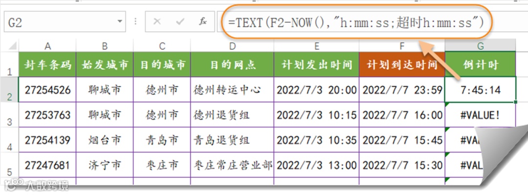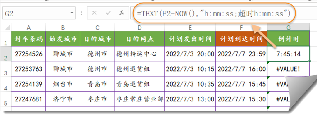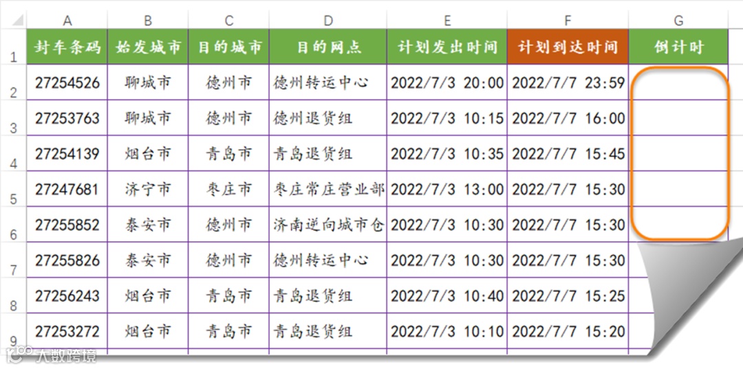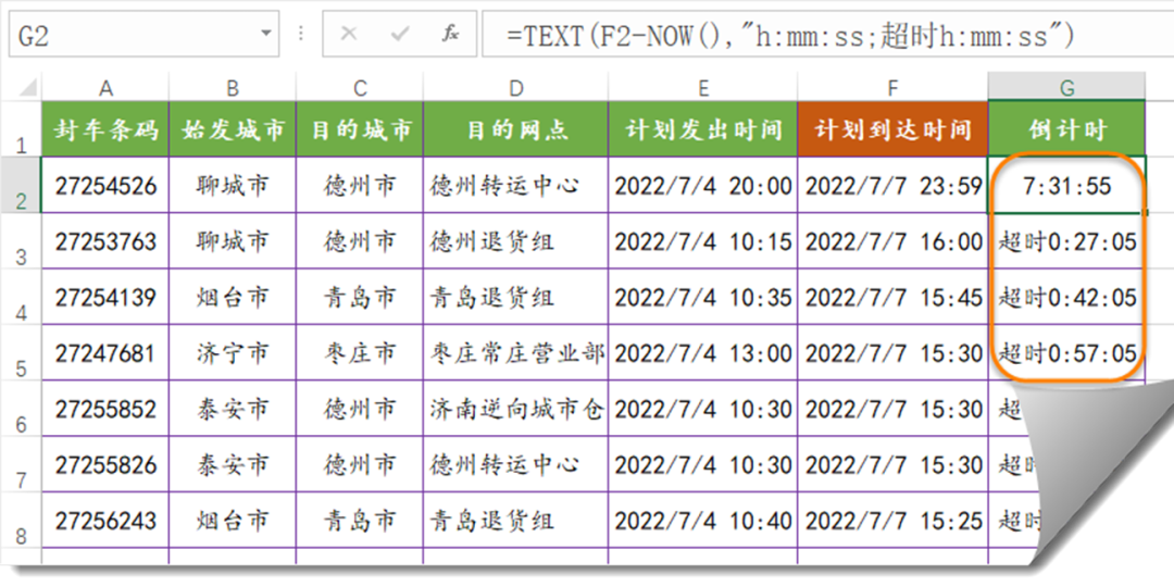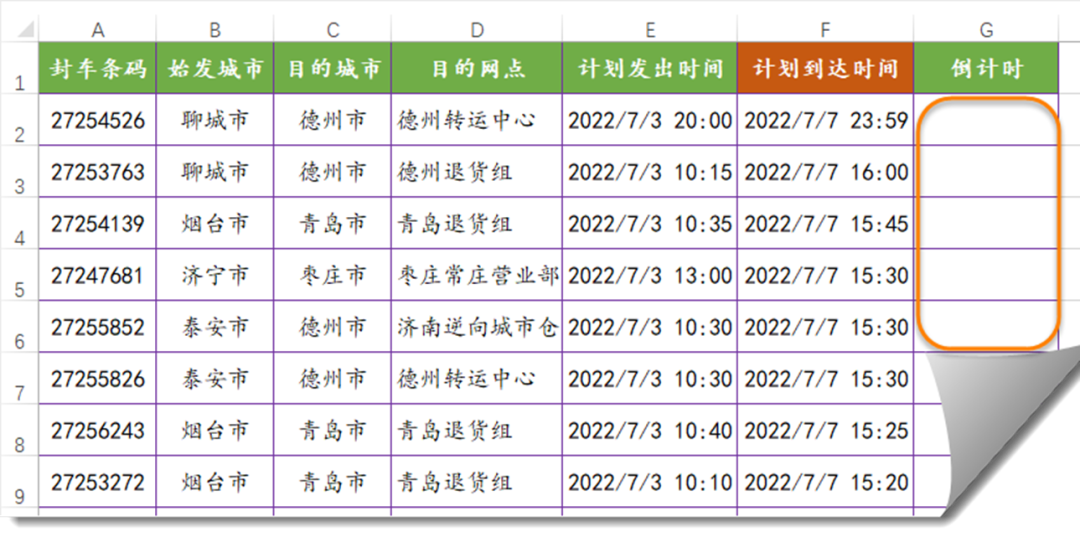 如下图所示,是某快递公司车辆运输表的部分内容。其中F列是计划到达时间,希望在G列得到这样的效果: