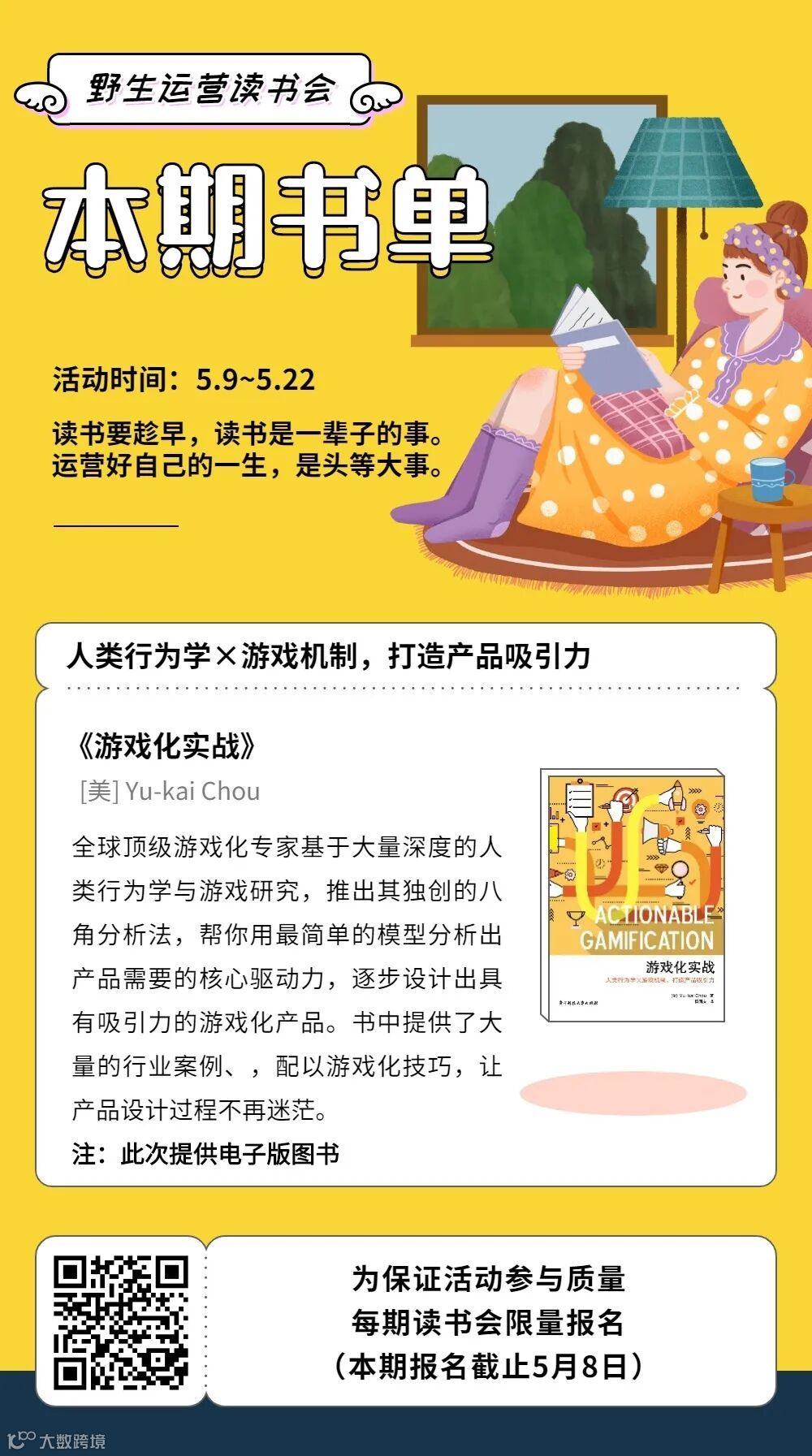 温馨提示:野生运营读书会是个神奇的组织,运营两年,每月1~2本共读雷打不动,至今已经共读了49本好书,下期我们会一起共读《游戏化实战》一书。如果你不想一个人寂寞读书,欢迎加入野生运营读书会,本期限量报名,扫码来占座: