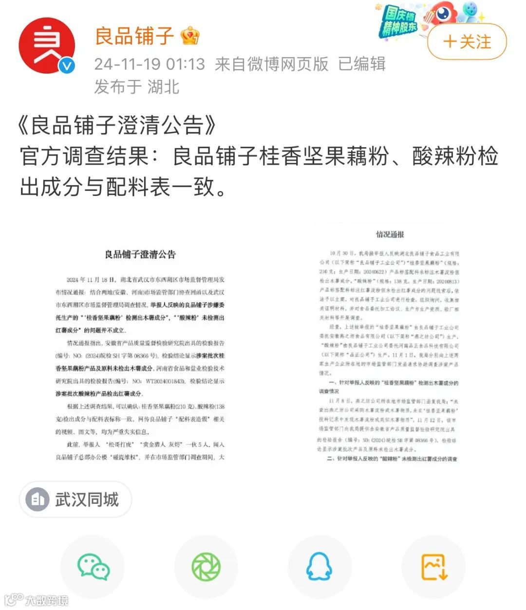 11月19日凌晨,良品铺子转发通报,并发布澄清公告称,官方调查结果显示,公司桂香坚果藕粉、酸辣粉检出成分与配料表一致。