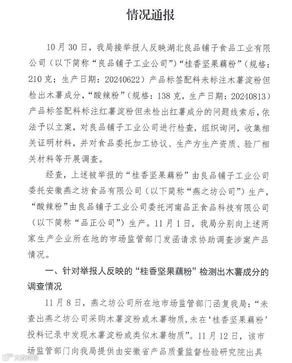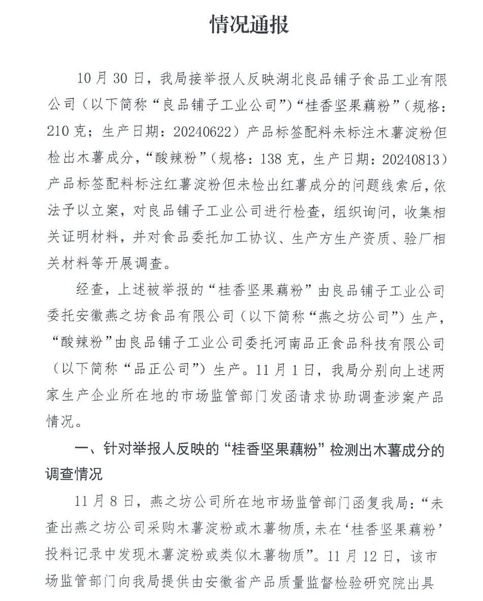 11月18日晚,东西湖区市场监管局通报此事调查结果:举报人反映的良品铺子工业公司涉嫌委托生产的“‘桂香坚果藕粉’检测出木薯成分”,“‘酸辣粉’未检测出红薯成分”的问题并不成立。