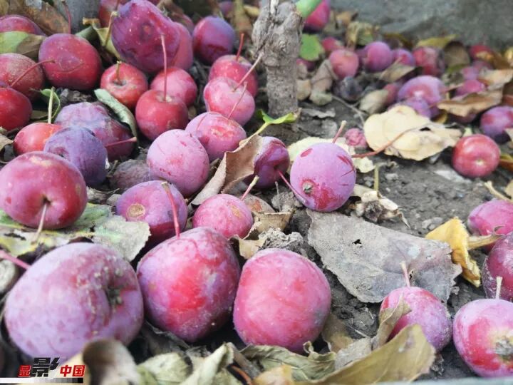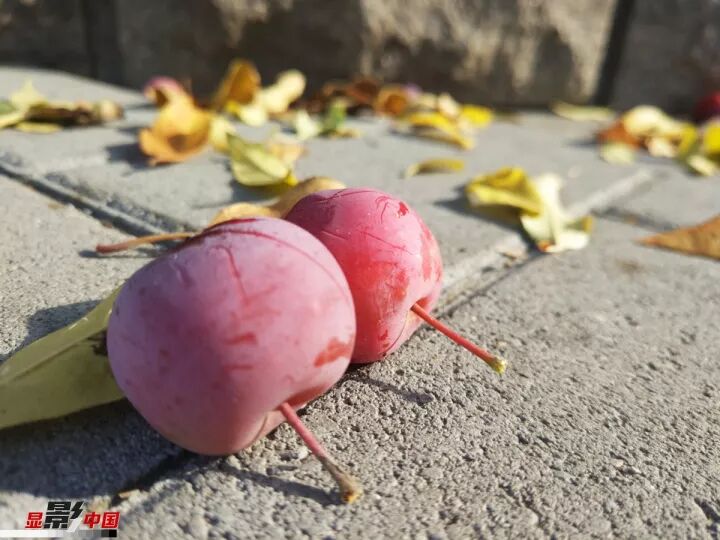 天津秋景:风吹落的海棠果红彤彤的颜色、新鲜的伤痕,看起来很好吃的样子。(胡彦竹摄)