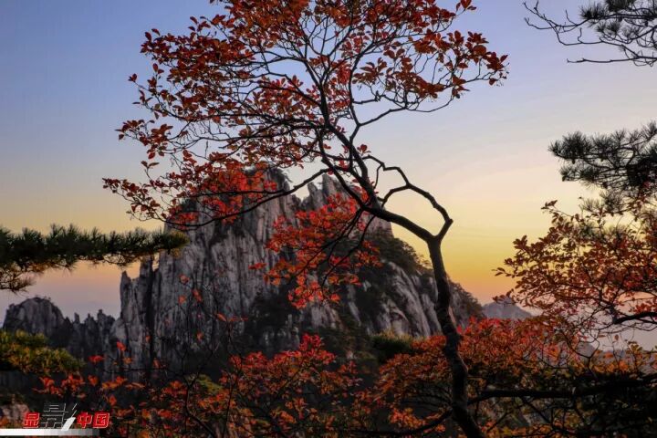 安徽秋景:2017年10月24日,世界自然与文化遗产地安徽黄山风景区风景迷人。当日,深秋季节的黄山风景区,满山遍野都被绚丽的色彩包围着,层林尽染,色彩斑斓,伴随着冉冉升起的日出,构成一幅幅美丽的画卷,吸引了大批游人前来观赏。 (水从泽 摄)