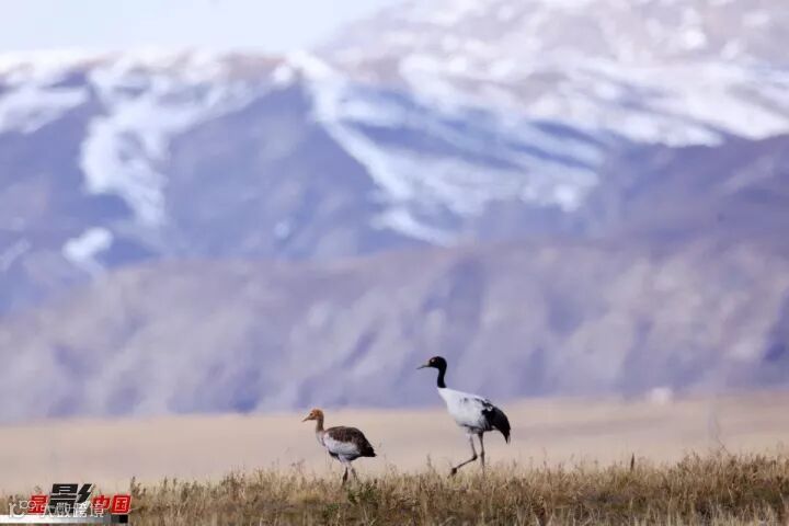 青海秋景:青海湖秋景。一只黑颈鹤带着自己的孩子在湖边“闲庭漫步”。(杨涛摄)