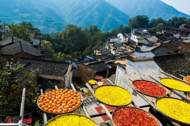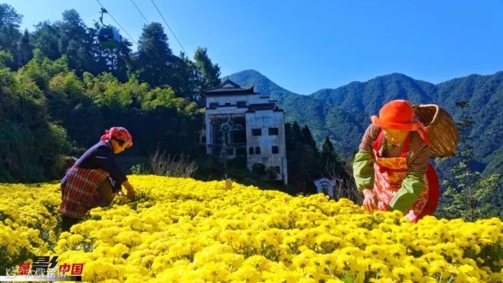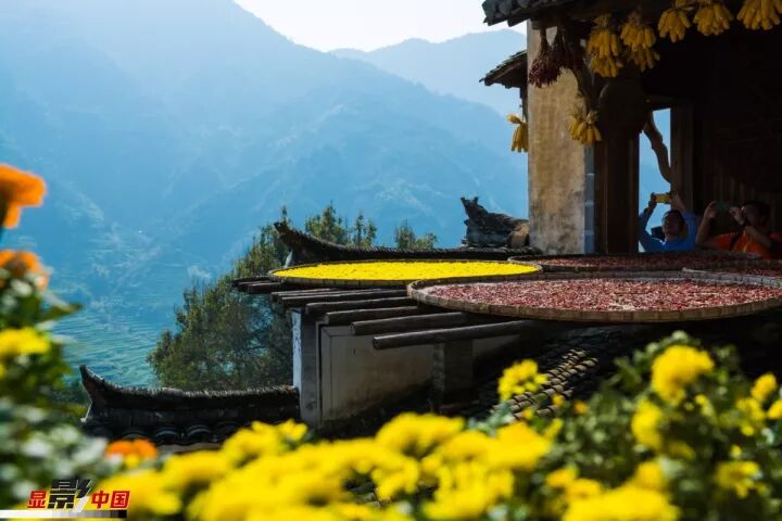 江西秋景:“愿得十月菊一克,不要黄澄万两金”,时下正是皇菊采摘季,江西婺源篁岭古村的皇菊种植基地呈现出“满城尽带黄金甲”的盛况。篁岭晒秋大妈抓住晴好天气采摘、晾晒皇菊,一派繁忙景象。篁岭晒秋从立秋开始进入旺季,到重阳佳节皇菊上晒架,进入晒秋高潮,明黄的菊花、火红的辣椒……将篁岭古村装扮成大自然的“调色板”,引来众多游客体验乡村美景。(曹加祥摄)
