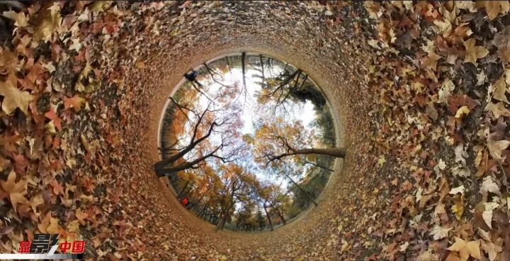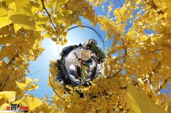 吉林秋景:金秋时节,一片片银杏叶好像张开的一个个小扇子,在枝头随风摇摆。在长春市东中华路,记者以独特视角记录银杏树叶的VR全景画面。(田甜 摄)