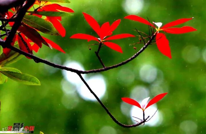 江苏秋景:10月11日,苏州街头几片绯红的树叶在雨露中的秋意景色。当日,受冷空气影响的古城苏州普降寒露过后的首场秋雨。街头、公园及环城河边的桂花、海棠等植物花果在雨露中晶莹剔透,冷艳欲滴,为初秋的一草一木披上了一件件华美外衣,格外引人注目。(王建中 摄)