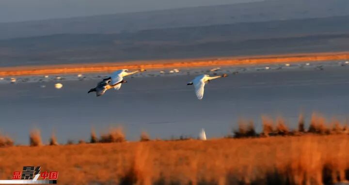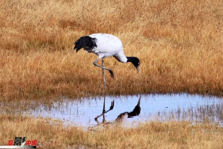 青海秋景:青海湖秋景。低头觅食的黑颈鹤和水中的倒影相映成画。(杨涛摄)