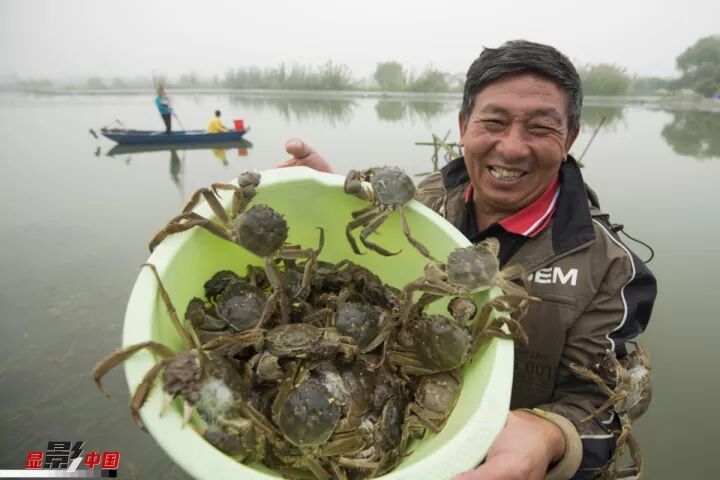 江苏秋景:10月10日,江苏省海安县白甸镇官垛村蟹农钱春华展示他养殖的螃蟹,笑逐颜开。地处苏中里下河地区的江苏省南通市白甸镇利用当地地势低洼、河道纵横、水网密布的天然优势,大力发展螃蟹规模化养殖,今年的螃蟹个儿大脚肥,丰收在望。目前全镇拥有7350亩螃蟹养殖基地,今年全镇预计创产值5000万元,大均收益近3000元。(徐劲柏 摄)