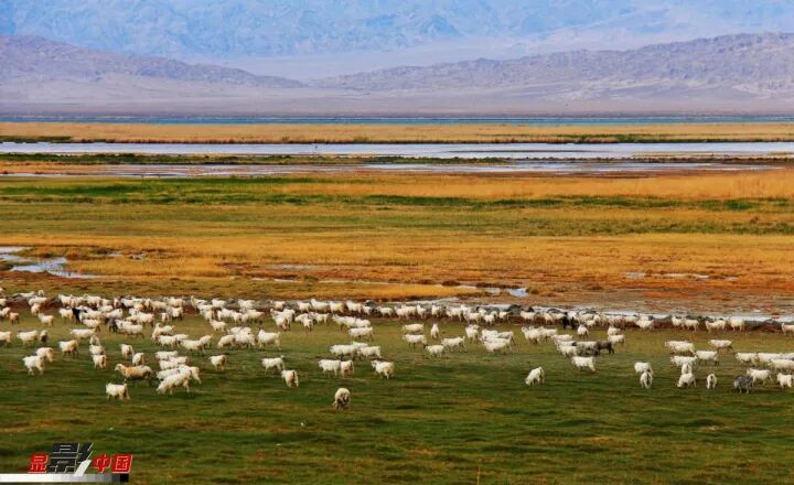 青海秋景:青海省海西蒙古族藏族自治州可鲁克湖秋景。羊群在可鲁克湖边“闲庭信步”。(张萍摄)