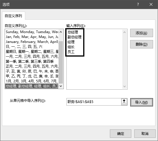 通过“自定义序列”的方法来创建一个特殊的顺序,并要求Excel根据这个顺序进行排序,就可以对切片器内的字段项进行自定义排序了,具体操作步骤如下。步骤1在工作表中添加“总经理”“副总经理”“经理”“组长”和“员工”职务大小的自定义序列,如图7-27所示,添加方法请参阅6.1.3小节。