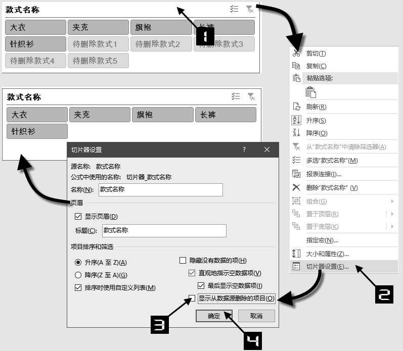 在切片器内右击,在弹出的快捷菜单中选择【切片器设置】命令,在弹出的【切片器设置】对话框中取消选中【显示从数据源删除的项目】复选框,最后单击【确定】按钮完成设置,如图7-30所示。