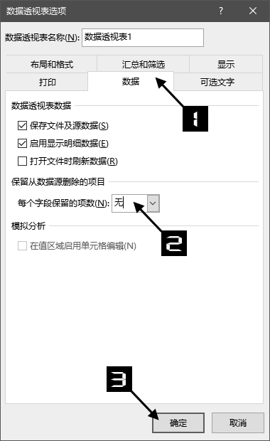 此外,调出【数据透视表选项】对话框,在【数据】选项卡中单击【每个字段保留的项数】下拉按钮,选择【无】选项,单击【确定】按钮,如图7-31所示。设置完成后刷新数据透视表,在切片器中就不再显示从数据源删除的项目。