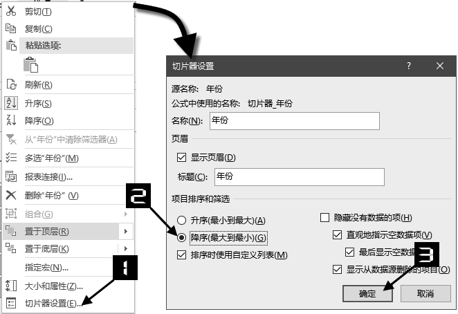 图7-23所示的切片器字段项是按年份升序排列的,如果希望按年份进行降序排列,其方法如下。