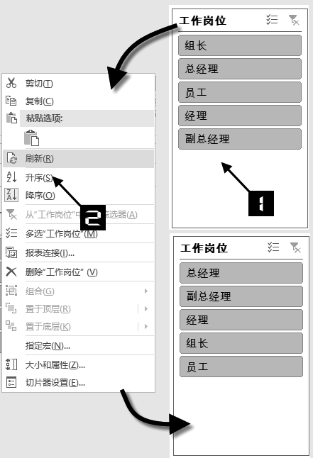 步骤2在切片器内的任意区域上右击,在弹出的快捷菜单中选择【升序】命令,即可对切片器内的“工作岗位”字段项按职务大小的自定义顺序进行排序,如图7-28所示。