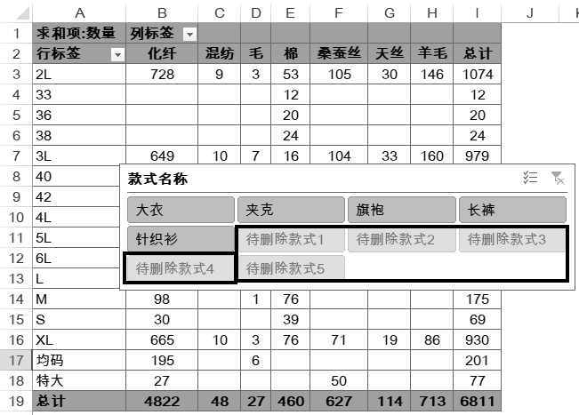 数据透视表插入切片器后,如果删除了数据源中一些不再需要的数据,数据透视表被刷新后,删除的数据也会从数据透视表中清除,但是切片器中仍然存在被删除的数据项,这些字段项呈现灰色不可筛选状态,如图7-29所示。