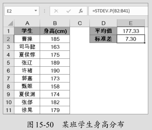 在E2单元格中输入以下公式,计算学生身高的标准差,返回结果为7.30。