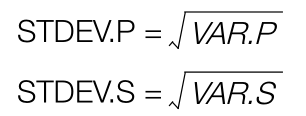 标准差在概率统计中常做统计分布程度上的测量,反映组内个体之间的离散程度,平均数相同的两组数据,标准差未必相同。Excel 2016中有两个计算标准差的函数,分别是STDEV.P函数和STDEV.S函数。标准差是方差的算术平方根,二者关系如下。