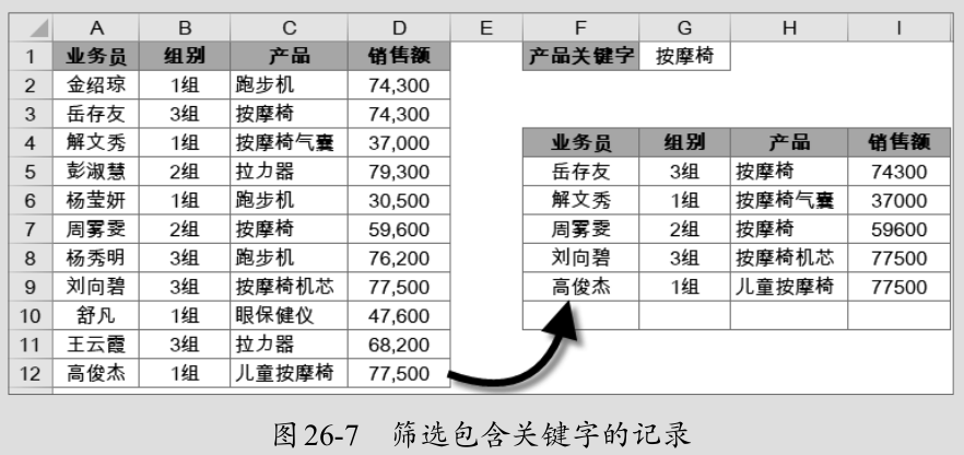 如图26-7所示,需要根据G1单元格中的产品关键字,从A~D列中提取出符合该条件的全部记录。