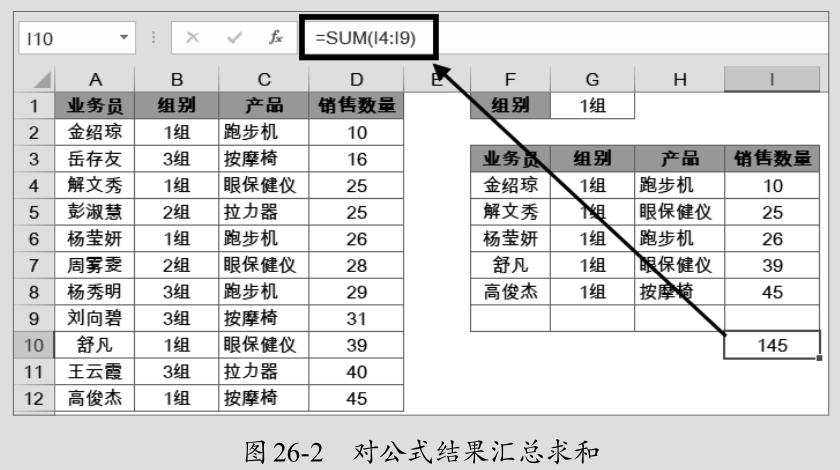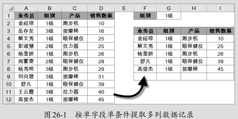 如图26-1所示,A~D列是某企业销售记录表的部分内容,需要根据G1单元格中指定的组别,提取出该组别的全部记录。