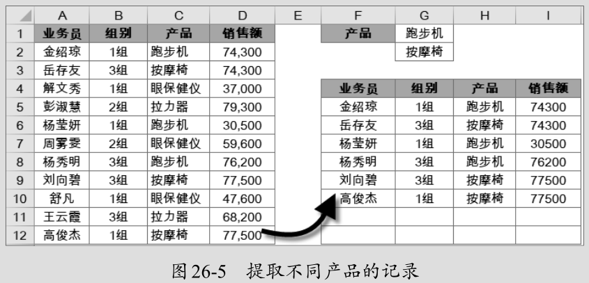 如图26-5所示,需要根据G1 单元格和G2单元格中指定的产品名称,从A~D列中提取出两个产品的全部记录。