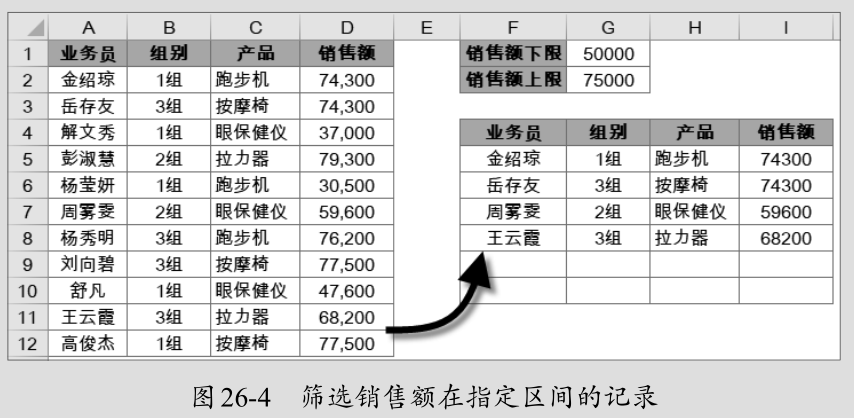 如图26-4所示,需要根据 G1单元格中指定的销售额下限和G2单元格中指定的销售额上限,从A~D列中提取出指定区间的全部记录。