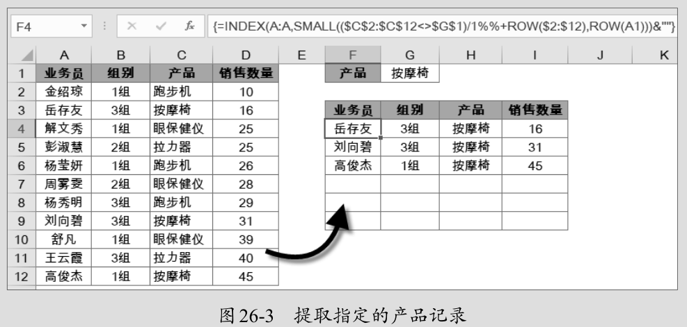 如图26-3所示,需要根据G1单元格中指定的产品名称,从A~D列中提取出该产品的全部记录。