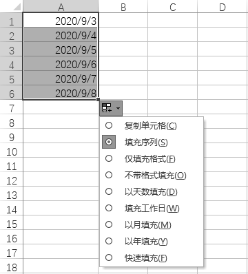工作日:填充时同样以天数作为日期数据递增变化的单位,但是跳过周末日期填充。