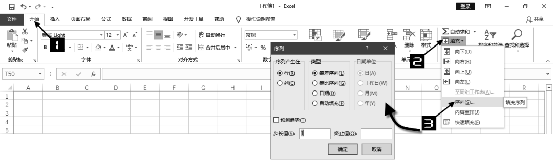 除了通过拖动或双击填充柄的方式进行填充外,使用Excel功能区中的填充命令,也可以在连续单元格中进行填充。