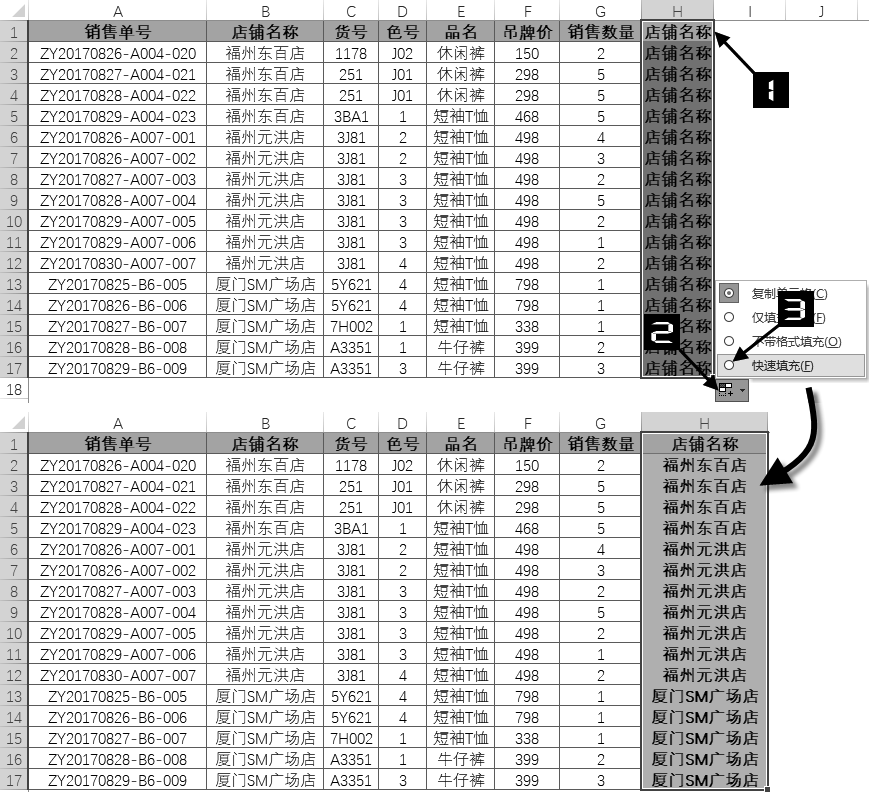 如图5-35所示,在H1单元格输入B1单元格中的内容,如“店铺名称”,在向下快速填充的过程中,就会自动填充B2、B3、B4……的相应内容