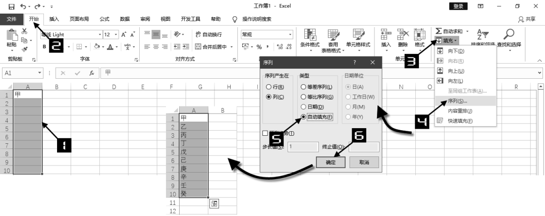 示例:使用自动填充连续输入“甲、乙、丙……”天干序列