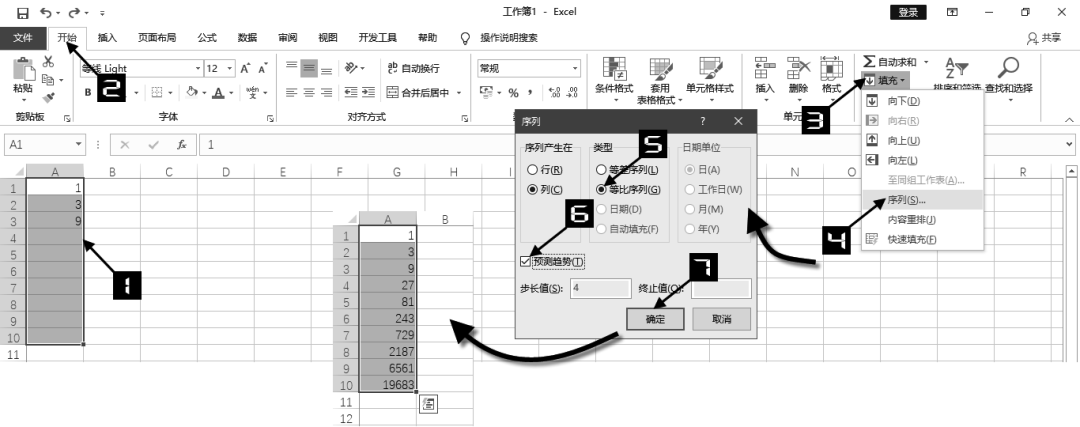 等比序列:使数值型数据按固定的比例间隔依次填充,需要在【步长值】文本框内输入固定比例值。
