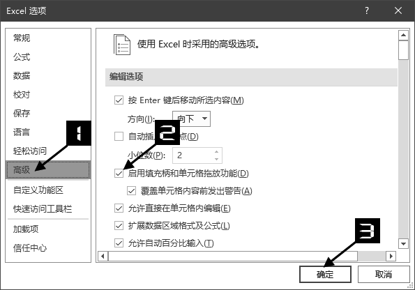 首先,需要确保“单元格拖放”功能被启用(系统默认启用),在【Excel选项】对话框【高级】选项卡【编辑选项】区域中,选中【启用填充柄和单元格拖放功能】复选框,单击【确定】按钮,如图5-21所示。