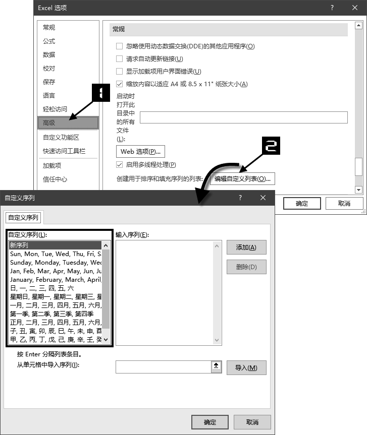 【自定义序列】对话框左侧的列表中显示了当前Excel中可以被识别的序列。所有的数值型、日期型数据都是可以被自动填充的序列,不再显示于该列表中。用户也可以在右侧的【输入序列】文本框中手动添加新的数据序列作为自定义序列,或者引用表格中已经存在的数据列表作为自定义序列进行导入。