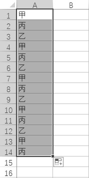 但是,如果用户提供的初始信息不符合序列元素的基本排列顺序,Excel则不能将其识别为序列,此时使用填充功能并不能使得填充区域出现序列内的其他元素,而只是单纯实现复制功能效果。例如,在图5-27所示的表格中,显示了从“甲、丙、乙”3个元素开始自动填充连续多个单元格的结果。