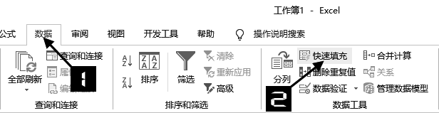 (1)选中填充起始单元格及需要填充的目标区域,然后在【数据】选项卡的【数据工具】组单击【快速填充】命令按钮,如图5-33所示。