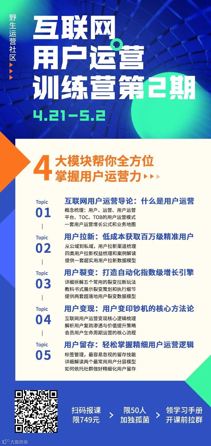这不,经过几周的快速迭代和调整,第2期开班来了!课程原价899元,限时立减150元,为了保证课程交付质量,本期限量报名,所剩座位不多,戳这里了解课程信息及报名:作为运营人,如果只能学习一个知识体系,我毫不犹豫选它