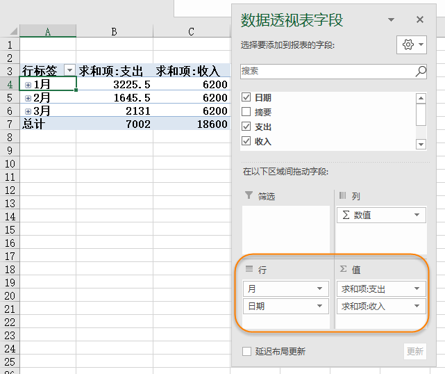 在【数据透视表字段列表】中,依次将日期拖动到行区域,将收入和支出拖动到值区域,此时Excel会自动对日期按月分组。