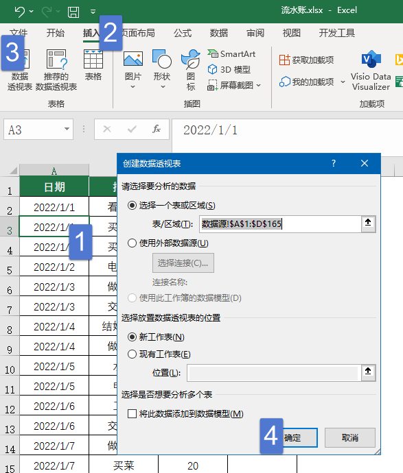 单击数据区域任意单元格,依次单击【插入】,【数据透视表】。保留【创建数据透视表】对话框中的默认选项,单击【确定】按钮。