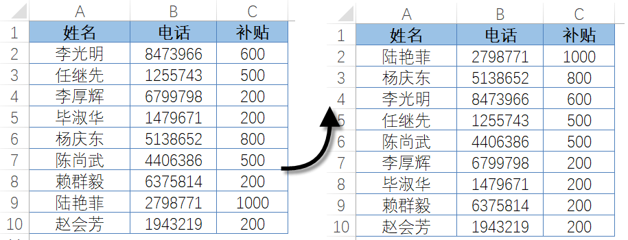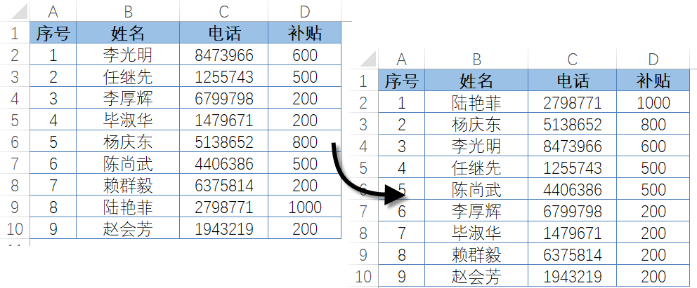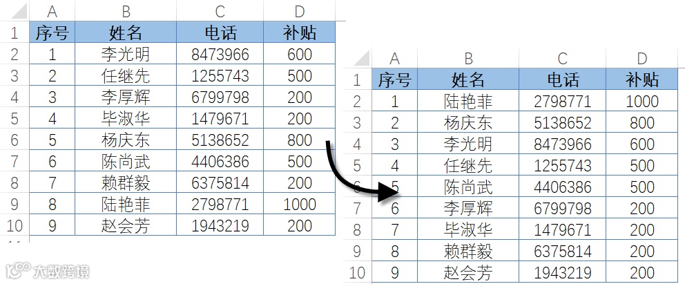 图4-58所展示的数据列表,未经排序的表格“补贴”字段的数据看上去杂乱无章,不利于查找及分析数据,而排序后的数据则一目了然。