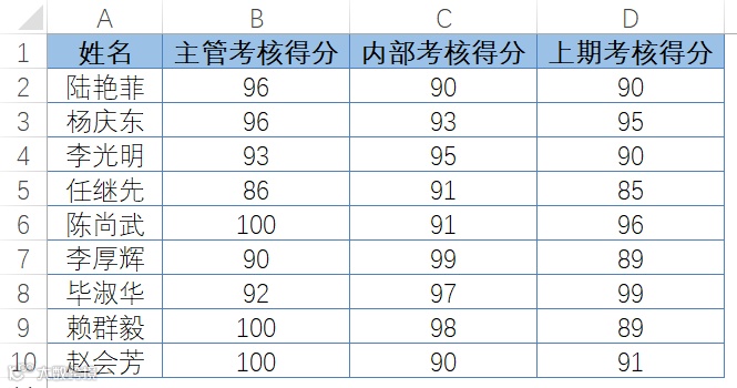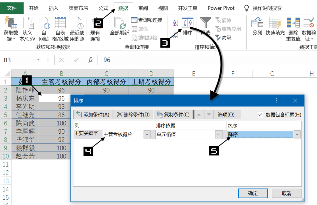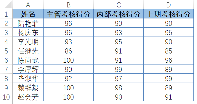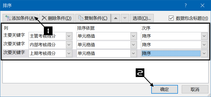 图4-63展示了某公司员工考核表,需要依次按照“主管考核得分”“内部考核得分”“上期考核得分”对数据列表进行降序排序。当“主管考核得分”相同的情况下,按“内部考核得分”降序排列,当“内部考核得分”再次相同的情况下,按“上期考核得分”降序排列。
