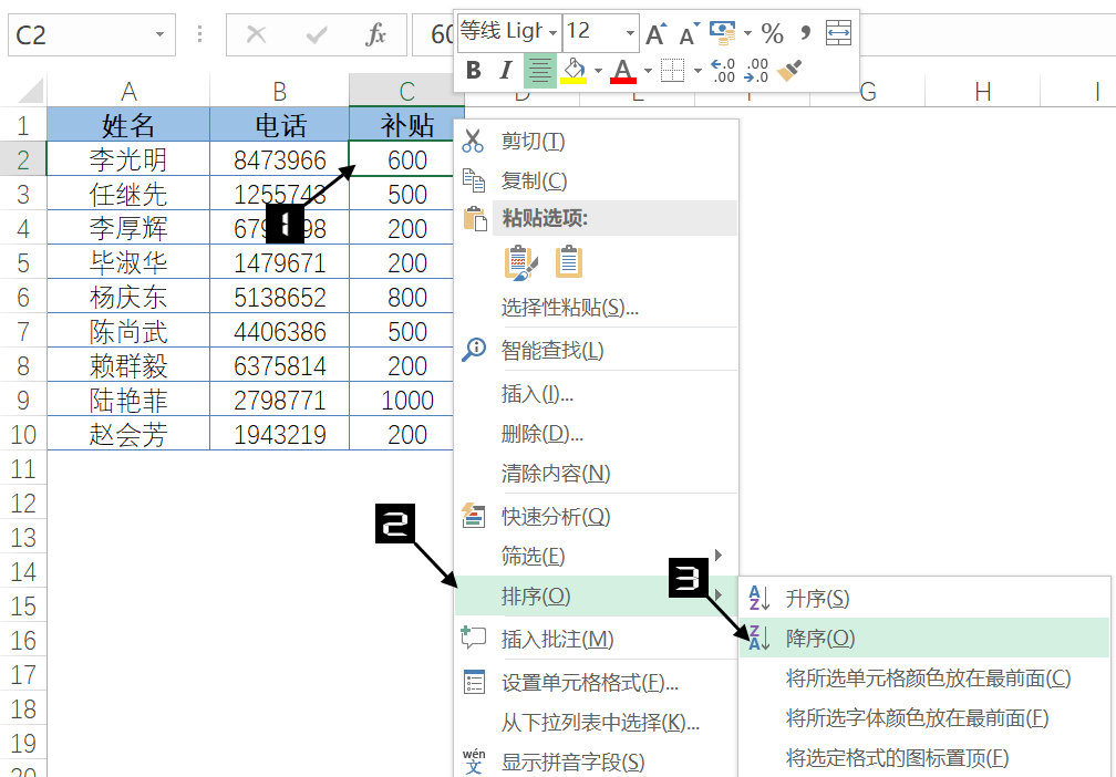 此外,也可以右击数据区域排序字段中任一单元格(如C2)在弹出的快捷菜单中依次单击【排序】→【降序】命令,完成按照“补贴”为关键字对数据列表降序排序,如图4-60所示。