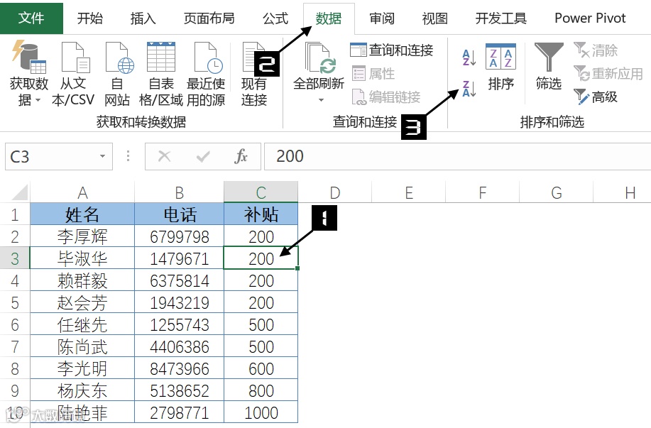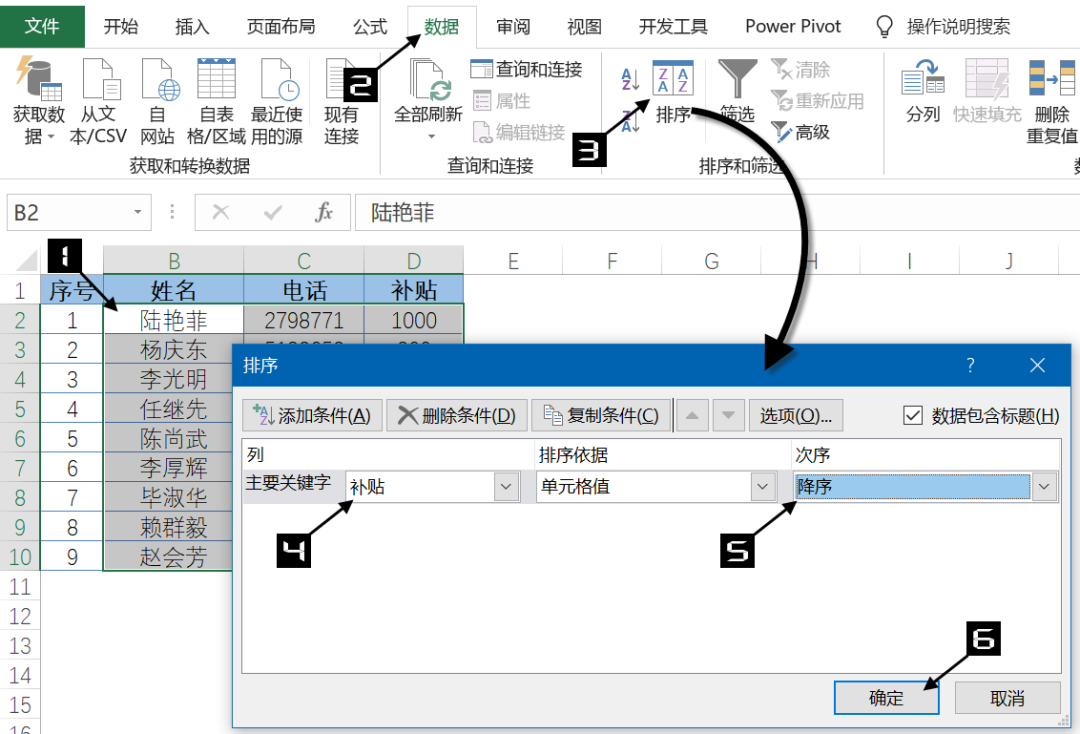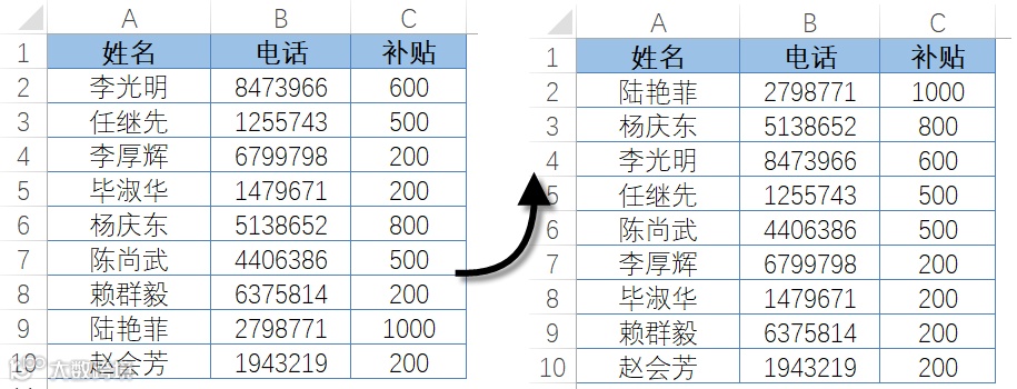 选取B1:D10单元格区域,在【数据】选项卡下单击【排序】按钮,在弹出的【排序】对话框中,【主要关键字】设置为“补贴”,【次序】设置为“降序”,单击【确定】按钮,关闭【排序】对话框即可。
