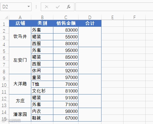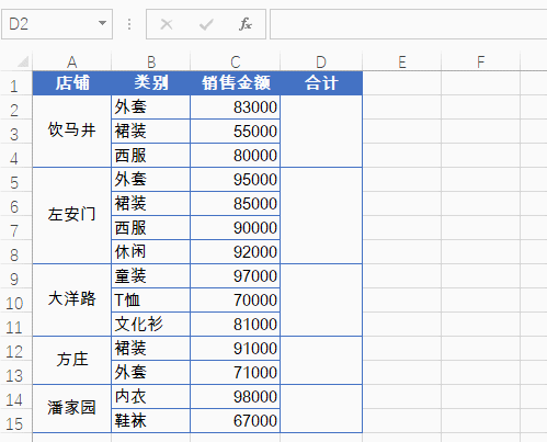 SUM(C2:C20)即当前行及以下所有C列数据的和,SUM(D3:D20)是本类别之后所有类别之和,二者相减,得到是本类别的和。