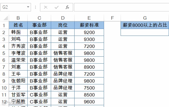 先使用COUNTIF(E:E,">8000")统计出8000以上的个数,然后用COUNT(E:E)计算出E列中的所有数值个数,二者相除得到占比。怎么样,拖后腿了没吗??