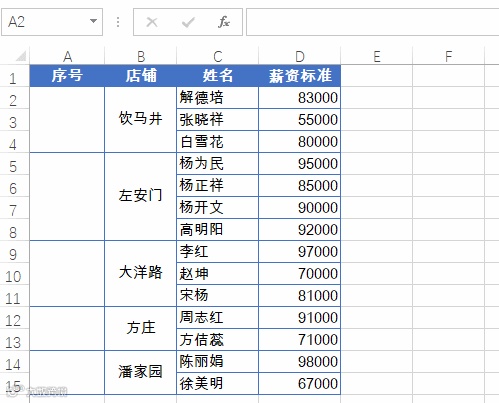 同时选中A2:A15单元格区域,编辑栏输入公式按Ctrl+回车:
