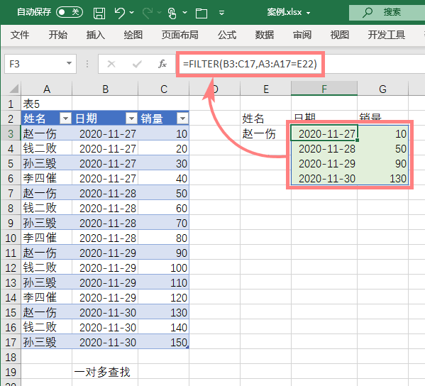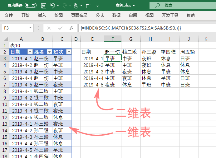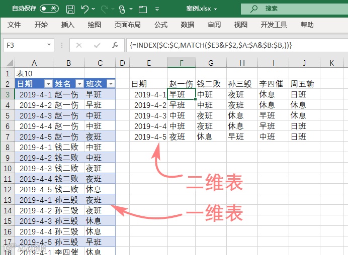 还有一些问题,看似不是查找,但也可以用查找的手法来完成,比如一维表转二维表,要将下图中左边的一维表转换为右边的二维表,表中的公式是: