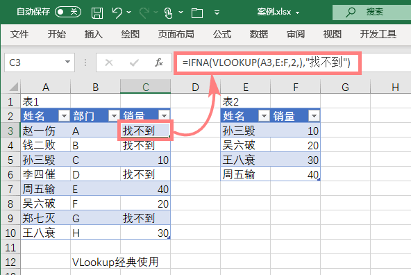 VLOOKUP经典的应用就是一对一正向查找,比如下图中表1和表2,要将表2中的销量填到表1里,就可以在C3中使用公式: