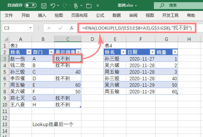 =IFNA(LOOKUP(1,0/(E$3:E$8=A3),G$3:G$8),"找不到")。