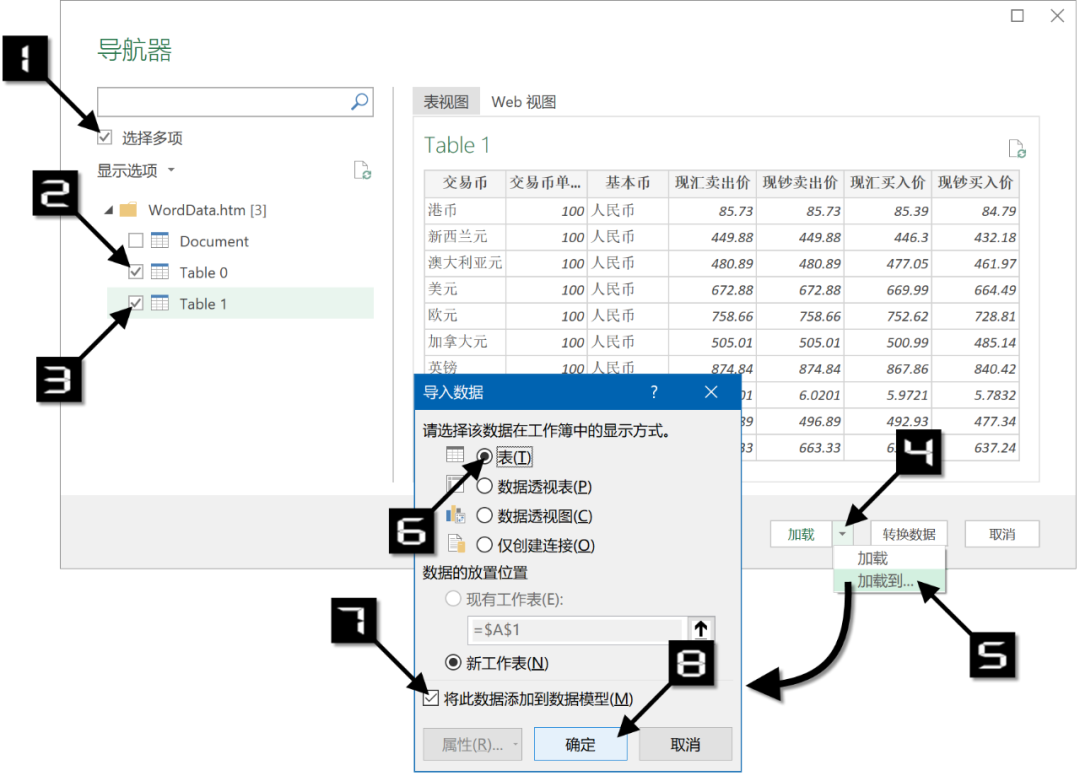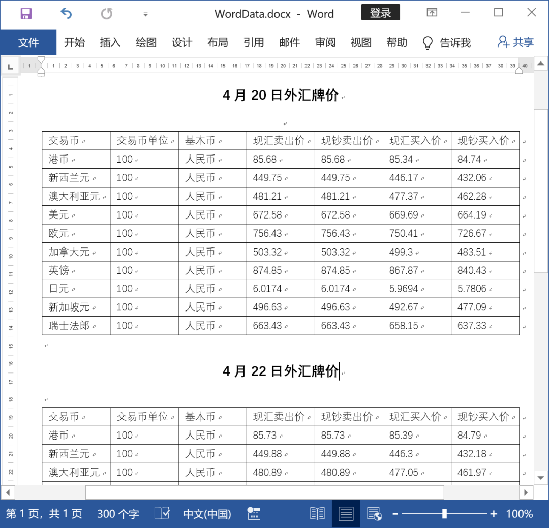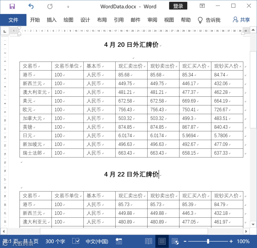 将 Word 文档中的数据导入 Excel 中,最简单的实现方法就是在 Word 中复制,然后再粘贴到 Excel 中。但是如果 Word 中有大量数据需要导入 Excel 中,复制粘贴操作会非常耗时,而且容易出错。示例 Word 文档为外汇汇率相关数据,其中有多个表格,如图 2-86 所示。按照如下步骤操作可一次性将 Word 中多个表格导入 Excel 工作表中。