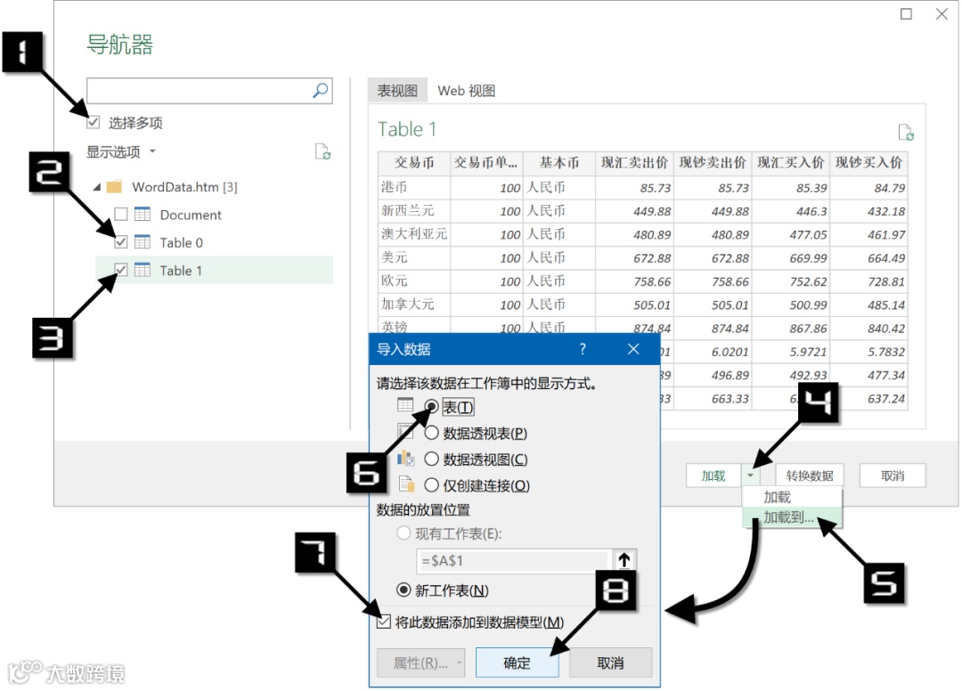 依次单击【加载】下拉按钮→【加载到 ...】命令,在弹出的【导入数据】对话框中选中【表】单选按钮,保持默认选中的【将此数据添加到数据模型】复选框,单击【确定】按钮关闭对话框,如图 2-90 所示。